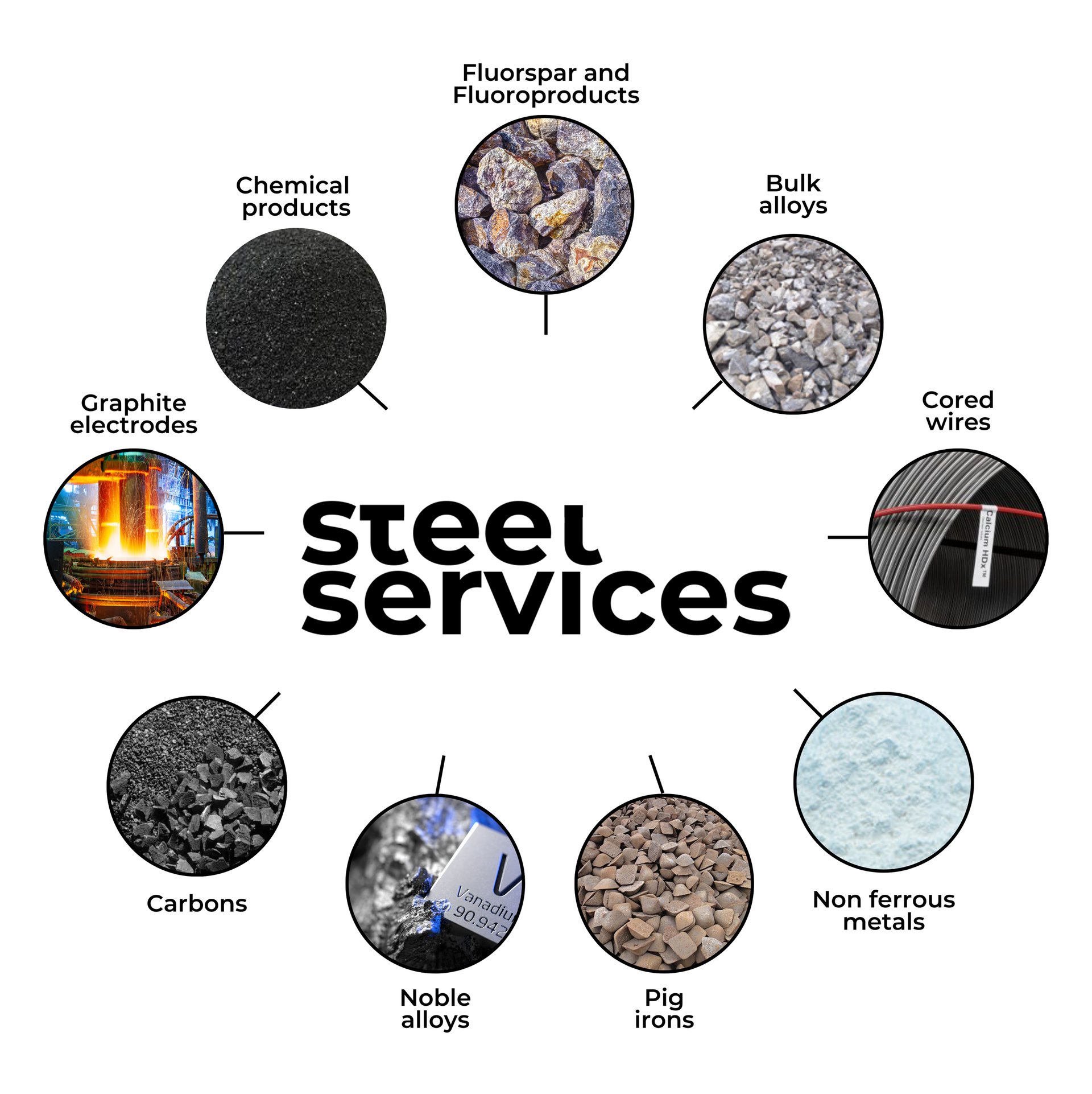 Based in the global commodities hub of Geneva, Switzerland, we are a trusted supplier of raw materials and industrial minerals, catering to the steel, refractory, and chemical industries. With a strong presence in the Middle East and the MENA region, we proudly represent a leading fluorspar producer from Mexico and a primary vanadium producer from South Africa. Our comprehensive product range includes all grades of fluorspar, bulk and noble ferro-alloys, vanadium chemicals, carbon products, recarburisers, graphite electrodes, and pig irons. Our commitment to reliability and excellence has earned us an established reputation in this market, making us a preferred partner for quality materials.